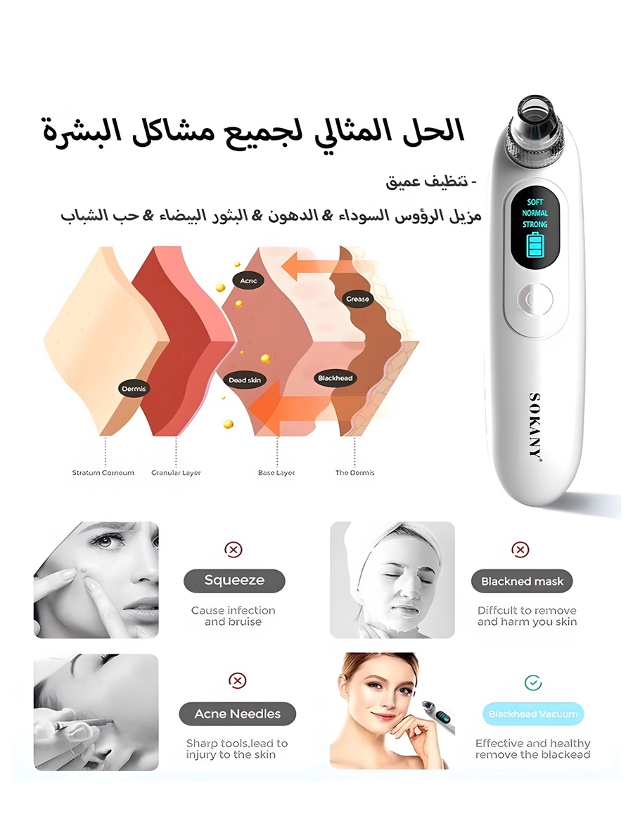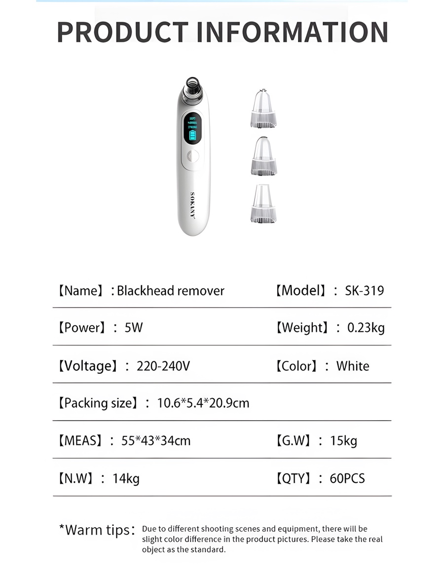 جهاز Sokany SK-319 هو أداة احترافية للعناية بالبشرة، بيجمع بين القوة والسهولة في الاستخدام علشان يديكي تنظيف عميق للوجه في البيت من غير الحاجة للصالونات.
