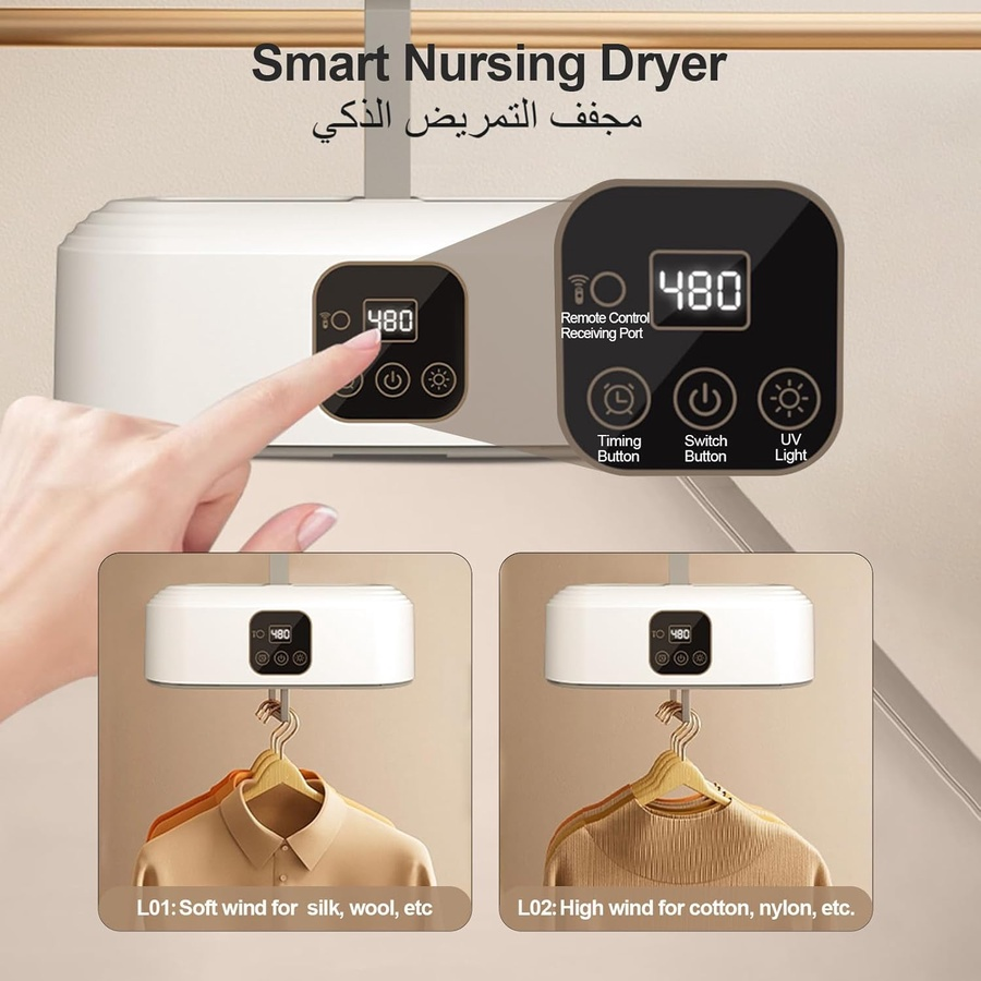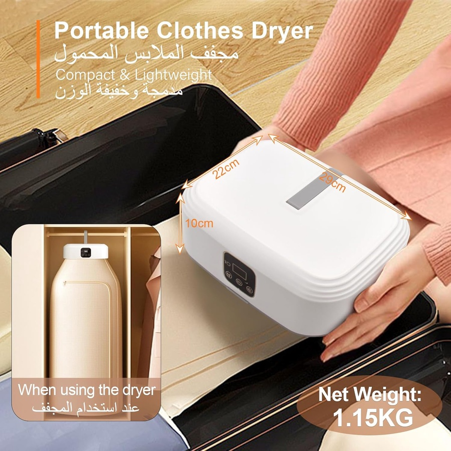 مجفف الملابس المحمول ينشف هدومك في أقل من ساعة من غير شمس ولا ريحة كمكمة، حجمه صغير ووزنه خفيف فتقدري تحطيه في أي مكان أو تاخديه معاكي في السفر، يشيل لحد 10 قطع ملابس وحرارته آمنة على كل الأقمشة.